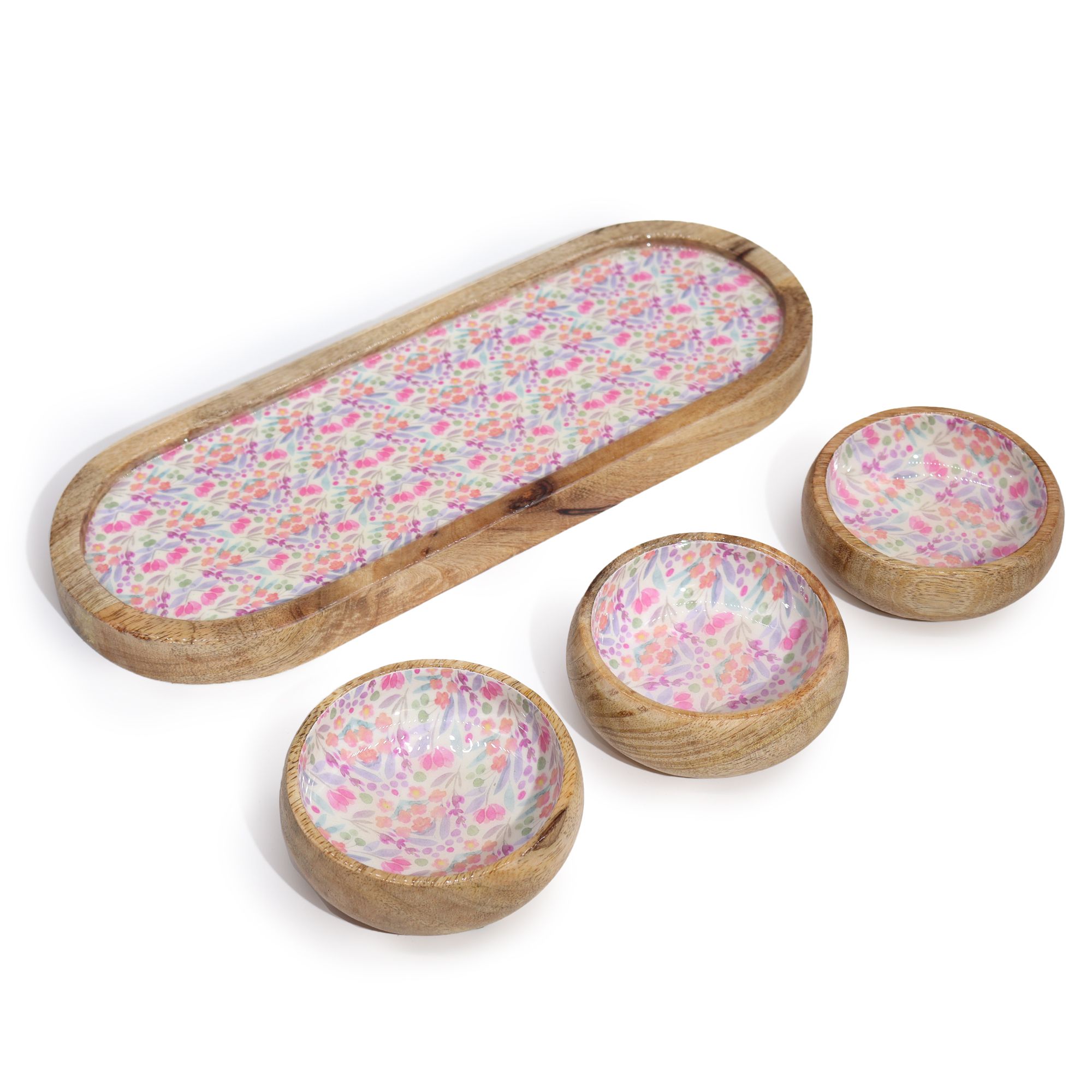 Mango Wood Tray with 3 Bowls – Pretty Floral