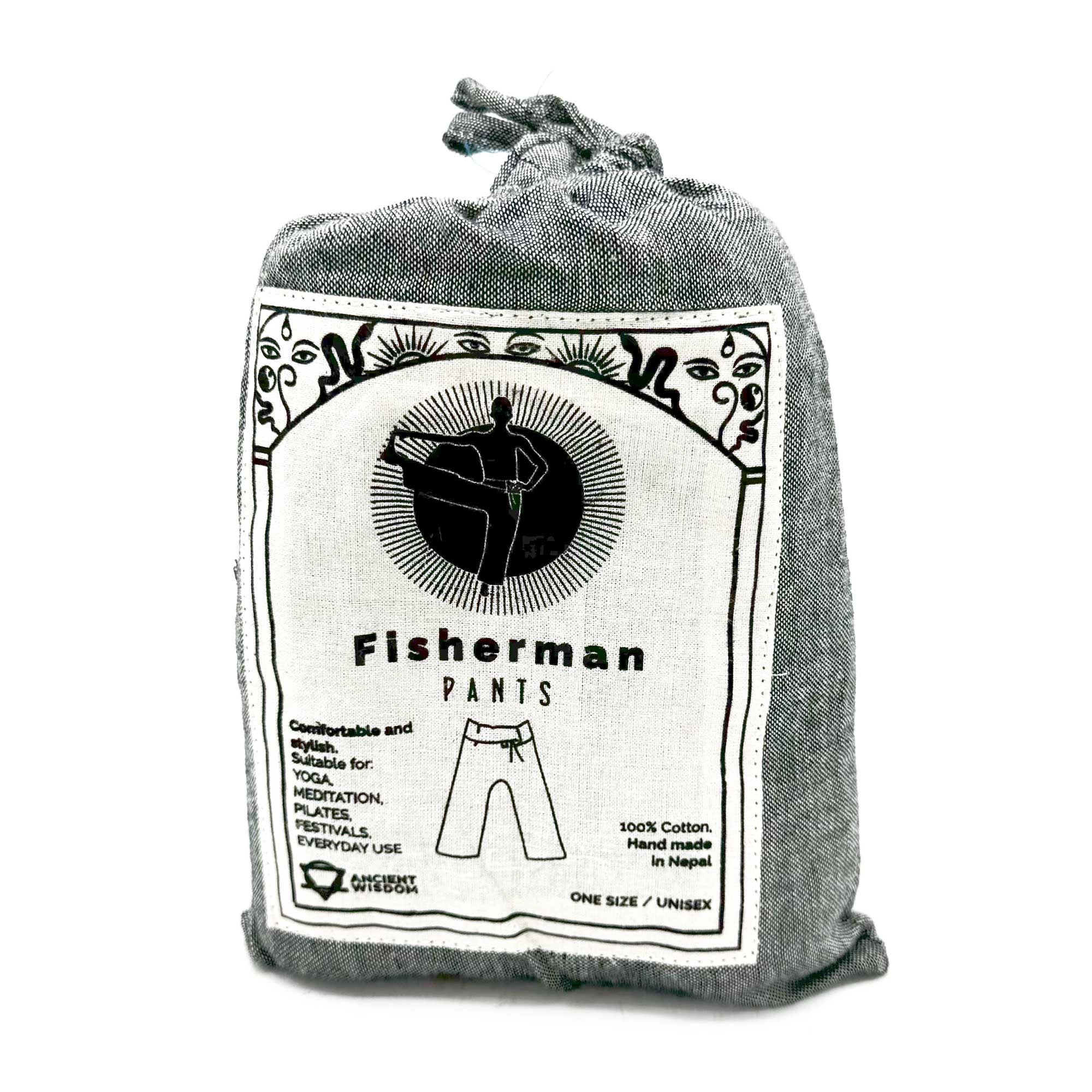 The grey colour in these Thai Fisherman yoga pants makes them look neutral and balanced, providing highlights for the mandala mantra designs to pop.